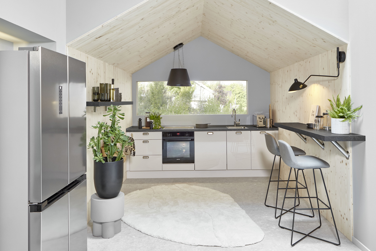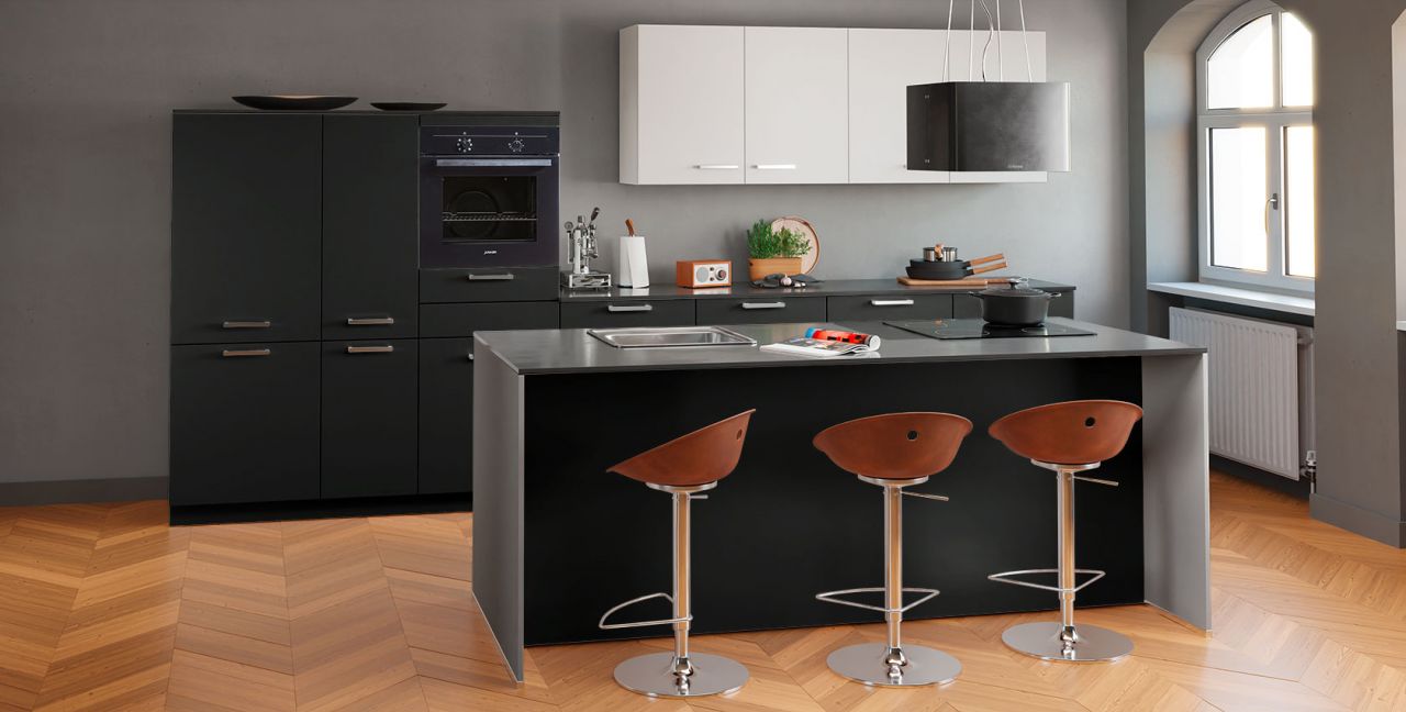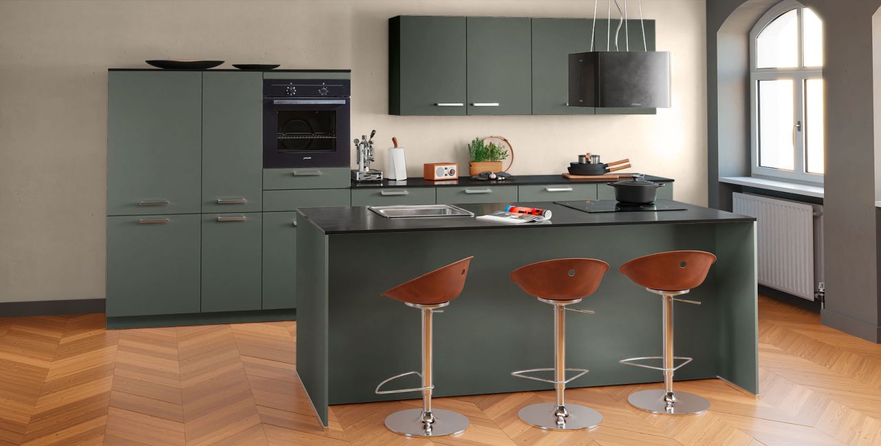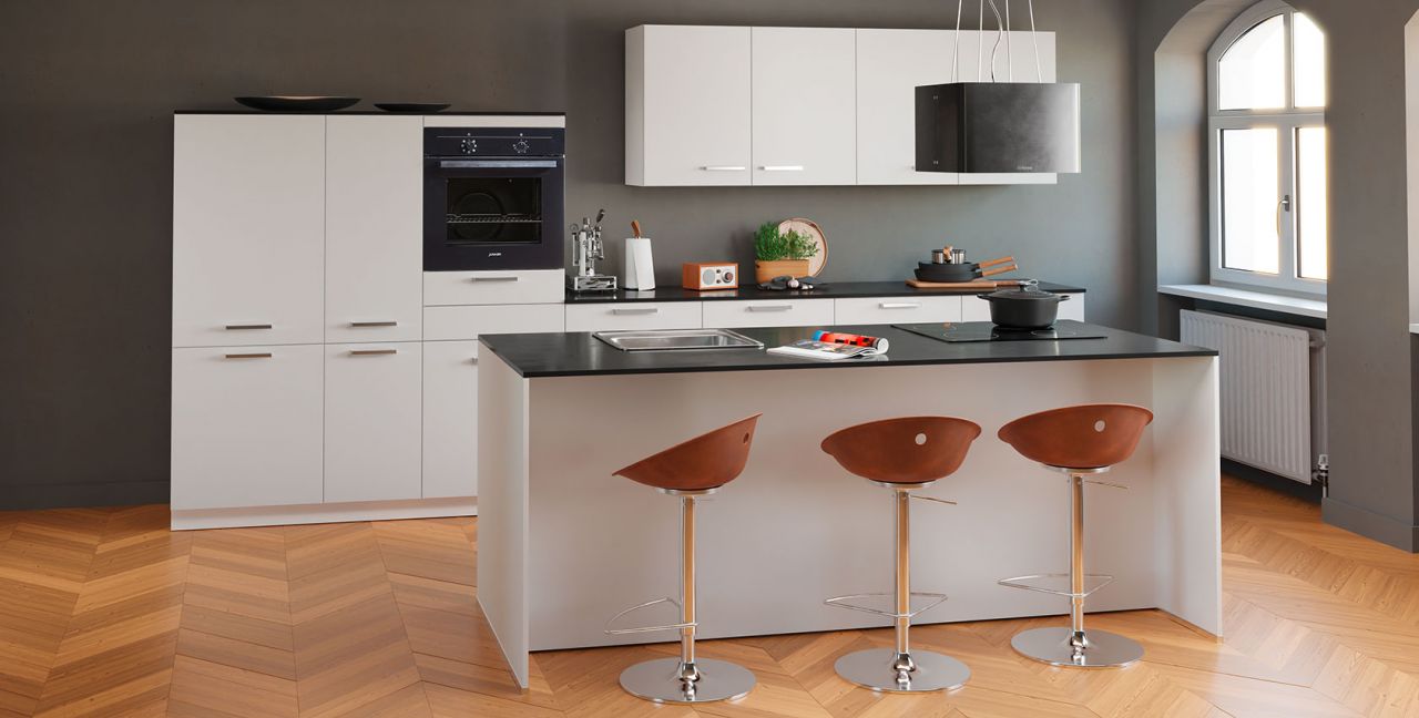 Inklusive Einbaubackofen schwarz Junker JF1300061 Energieeffizienzklasse A, Glaskeramik Kochfeld Junker JR36DT54, Inselesse Edelstahl Airforce F181ED Energieeffizienzklasse B, Kühlschrank Laurus LKG88E Energieeffizienzklasse E, Einbauspüle Edelstahl Rodi NewManaus, Geschirrschrank, Esstheke, XL-Schränken.