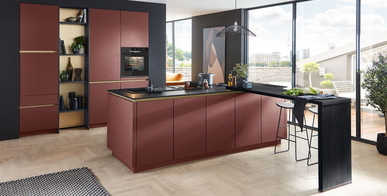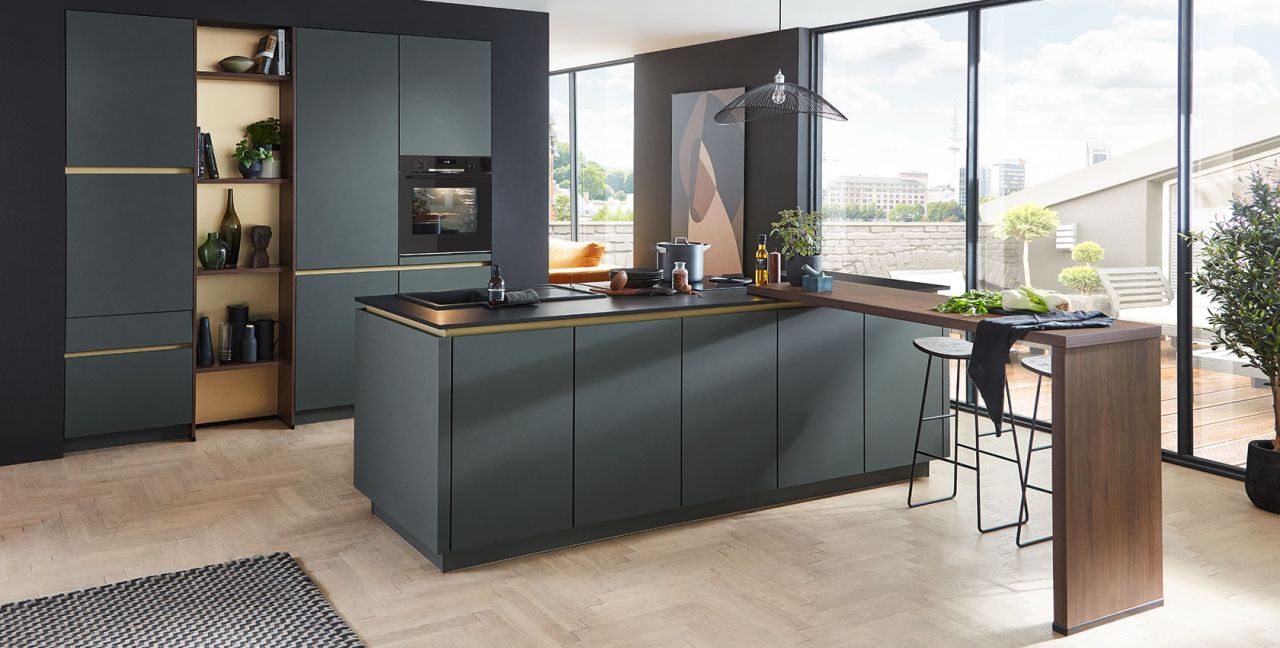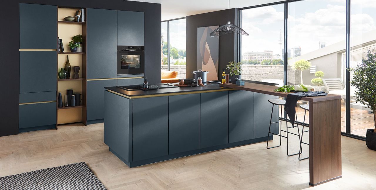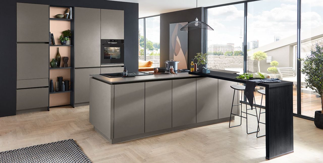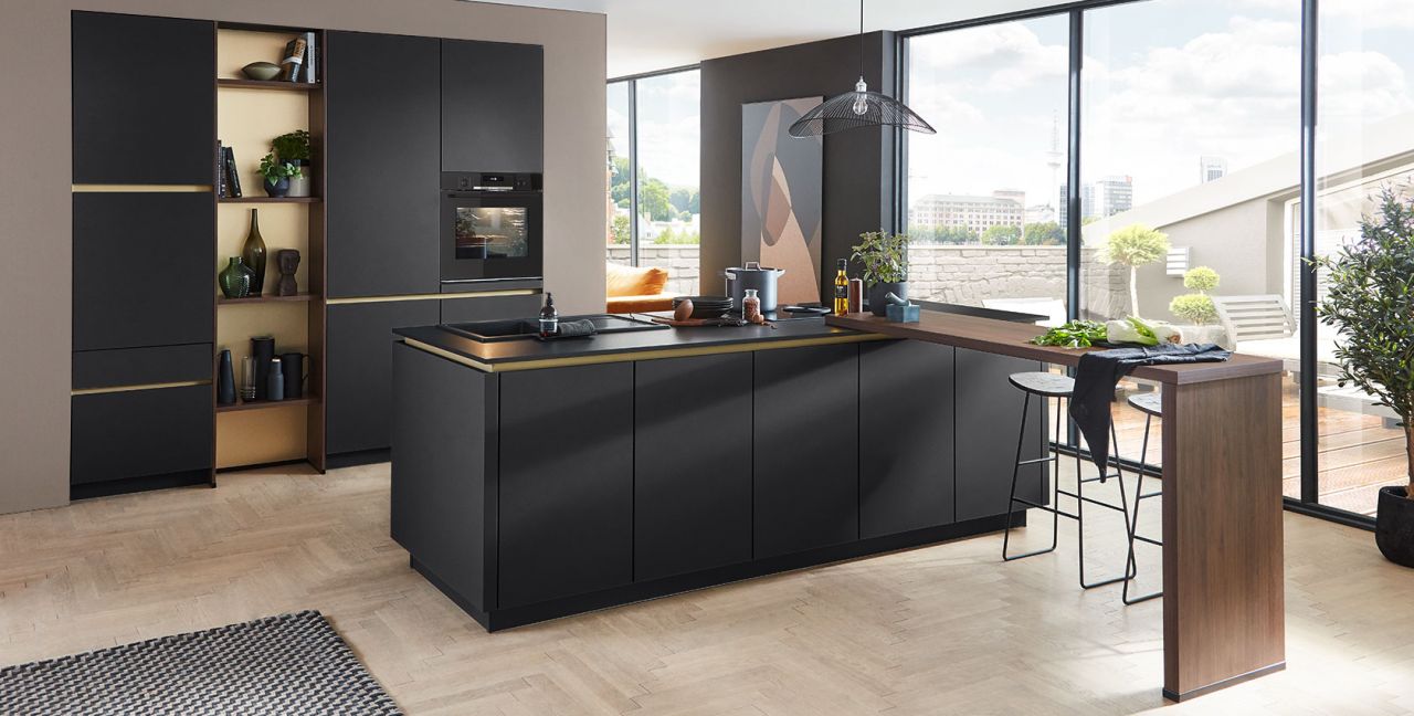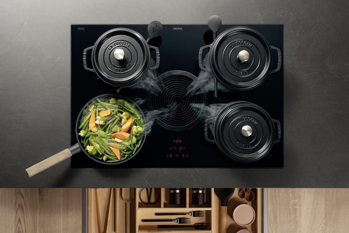 Inklusive Einbaubackofen schwarz Bosch HBG578EB7 Energieeffizienzklasse A+, Glaskeramik Kochfeld mit Induktion und Kochfeldabzug (Umluft) Bora GP4U, Kühlschrank Progress PK1215 Energieeffizienzklasse E, Einbau-Designspüle Elleci Logik 300, XL-Schränken, Unterschränken mit Großraumauszügen, Wandborden.