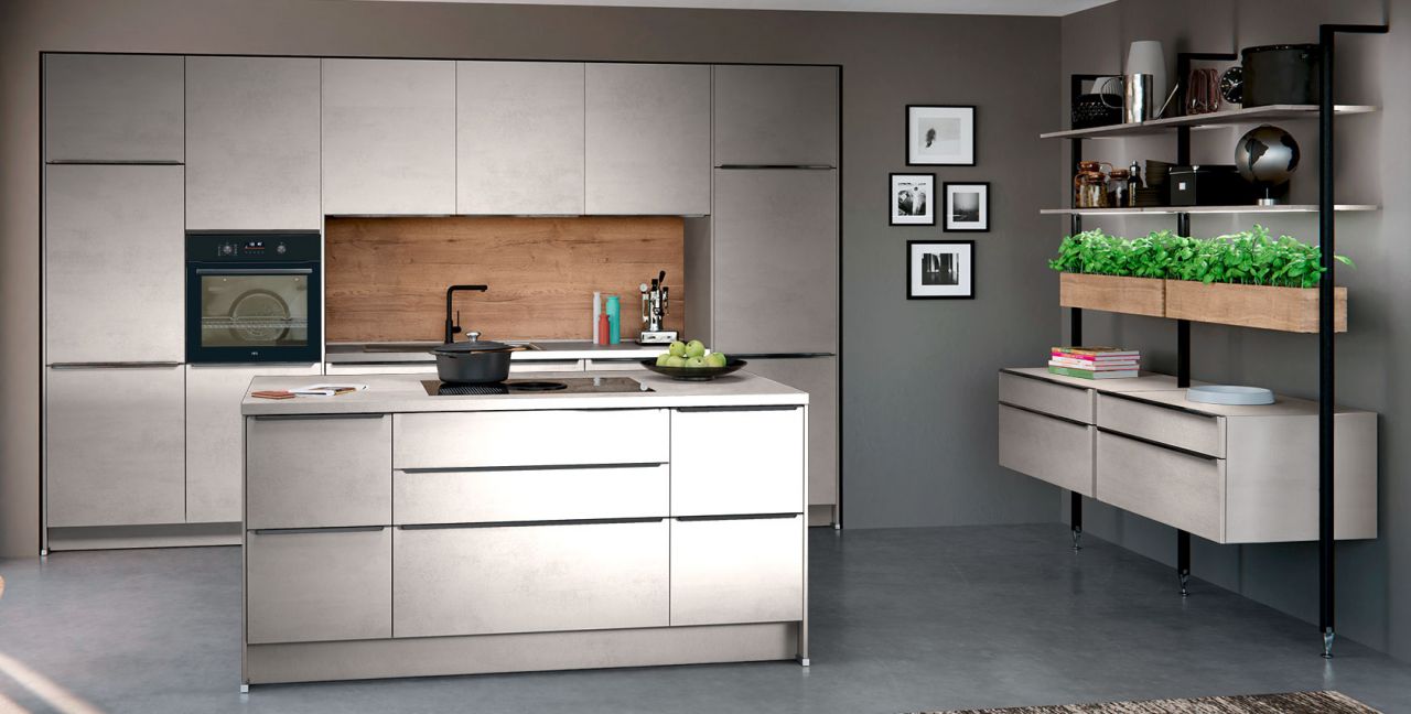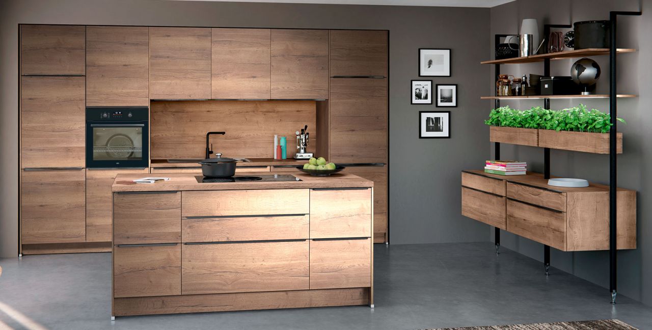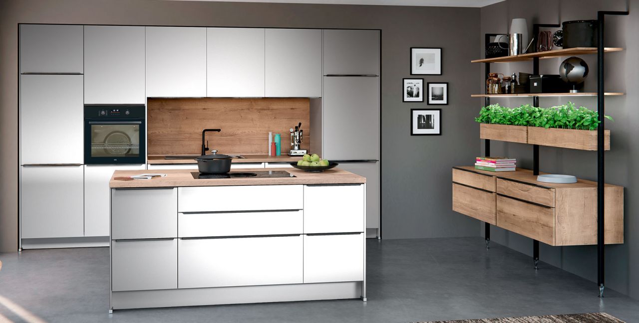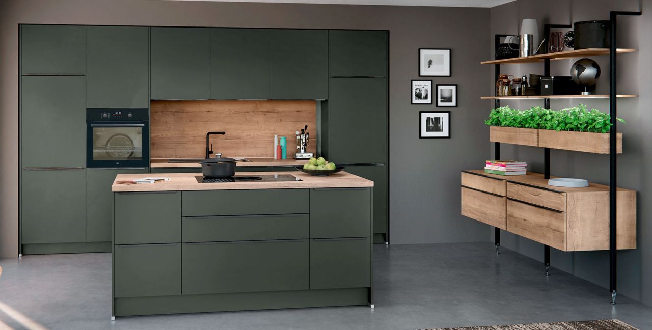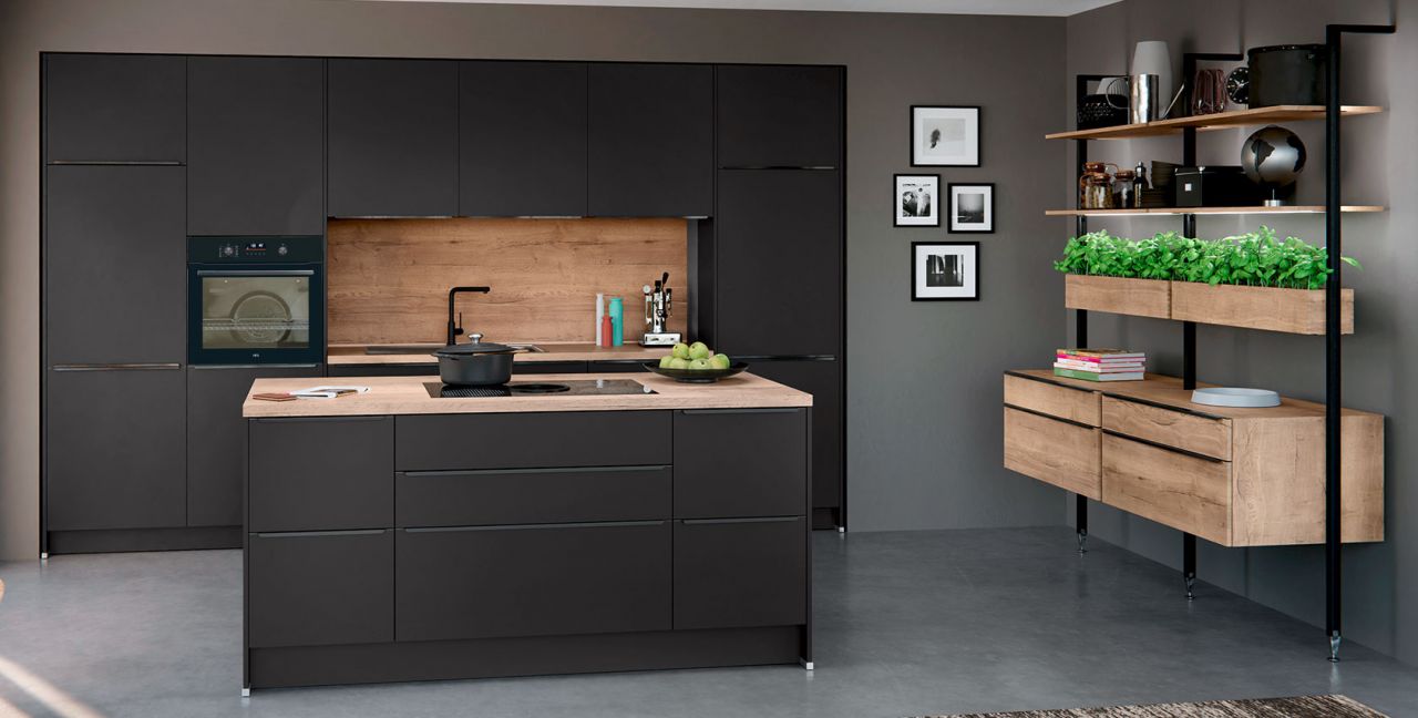 Inklusive Einbaubackofen schwarz AEG NBU5P40SK Energieeffizienzklasse A++, Glaskeramik Kochfeld mit Induktion und Kochfeldabzug (Umluft) Bora GP4U, Kühlschrank mit **** Gefrierfach Progress PK0855 Energieeffizienzklasse E, Einbauspüle Edelstahl Rodi Okio Line 85 Deep, Stollenregalsystem, Unterschränken mit Großraumauszügen.